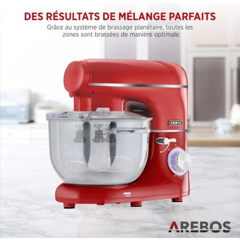AREBOS 6 En 1 Robot Cuisine Multifonction 1500W Rouge Robot Pâtisserie 6 Vitesses Bol En Inox 5,5 L Pichet En Verre 1,5 L