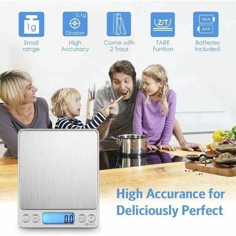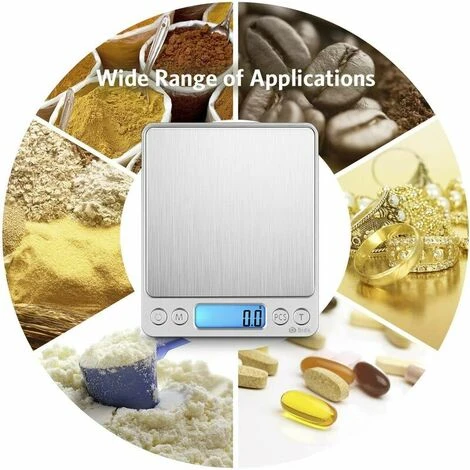 Balance de Cuisine, 3kg/0.1g, Balance de Poche de Precision, Écran LCD Rétroéclairé, Fonction de Tarage Count Pieces: Cette échelle de table numérique inclut le comptage de pièces fonction, qui est incroyablement utile pour les bijoux, et la cuisine. Il est simple de la technologie pour la vie intelligente.Pour régler le temps d’inactivité de la fonction d’arrêt automatique : 1. Lorsque la balance est éteinte, appuyer et maintenir enfoncée la touche M, et en même temps, appuyer rapidement sur la touche ON / OFF 4 fois jusqu’à ce que le temps d’inactivité soit affiché, puis relâcher le bouton. 2. Pour changer le délai avant l’arrêt automatique : appuyez sur la touche M pour choisir le temps entre 0 »/60 »/120 »/180 », après avoir choisi, appuyez sur la touche ON / OFF pour établir avec succès.REMARQUE: L’option 0 désactive la fonction d’arrêt automatique.Caractéristiques: – Nombre de pièces: 25, 50, 65, 75, et 100 – Six unités: G, OZ, ozt, DWT, GN, CT – Couleur: Produit (argent) Deux couvertures (transparent) – Portée: 3000g / 0.1g – Taille de l’emballage: 735 mm * 365 mm * 19 mm – Produit Taille: 127mm * 106mm * 19 mm (L * W * H)Remarque: ▲ Lo: basse tension. ▲ O-Ld: Plus de charge.Emballage inclus: 1 x Balance de Cuisine 2 x pallets 2 x piles AAA 1 x Manuel de l’utilisateur