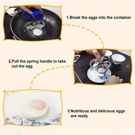 - 【Facile à utiliser】 Déposez doucement un œuf dans chaque tasse, faites cuire à votre guise, puis sortez le pochoir de la casserole. Tirez sur la poignée à ressort pour placer les œufs sur des assiettes, des toasts ou des petits pains.