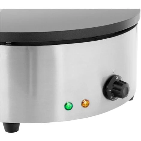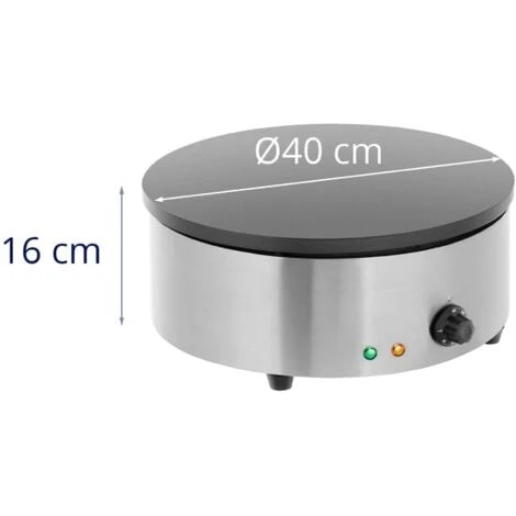 La crêpière dispose d’une plaque de cuisson ronde, en fonte d’acier, de 40 cm de diamètre. La fonte d’acier, en plus d’être robuste et résistante, présente une conductivité thermique optimale. Ce revêtement vous garantit, par ailleurs, que la pâte à crêpe ne restera pas collée à la plaque lors de la cuisson. Grâce à sa forme ronde, cet appareil est particulièrement économe en place.