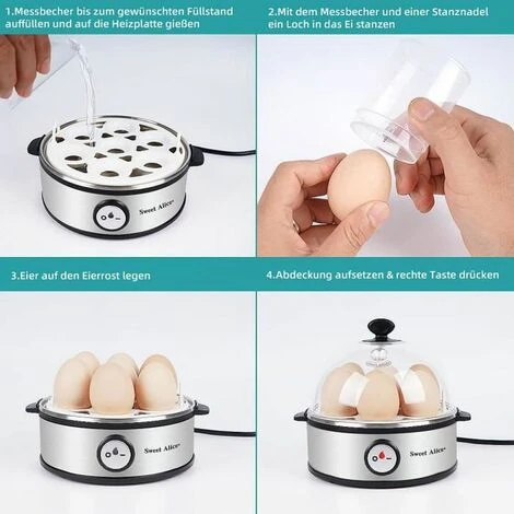 Ce chauffe-œufs peut préparer une grande variété d’œufs. Par exemple, des œufs à la coque, à point ou durs, des œufs à la vapeur, des sandwichs aux œufs, des œufs pochés.