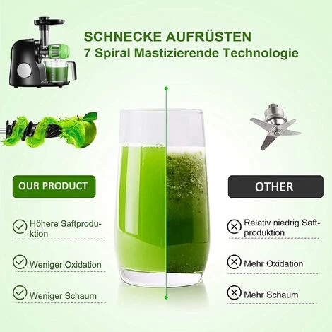 【Maximaler N?hrstoffgehalt& H?here Saftausbeute】 Dieser Entsafter verwendet einen Motor mit niedriger Geschwindigkeit (80 U/min), der den N?hrwert Ihrer Zutaten am besten beibeh?lt und den oberen Schaum verringert. Niedrige Geschwindigkeit bedeutet keine Hitzeentwicklung und weniger Oxidation. was die Vitamine, Enzyme, Mineralstoffe und Spurenelemente stark speichert. Bis zu 90% mehr Nahrungswachstum und eine l?ngere Haltbarkeit erm?glicht, bevor es verzehrt oder gelagert werden muss.