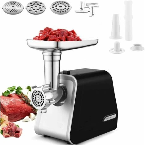 - Le hachoir à viande électrique en acier inoxydable comprend 3 plaques de coupe en acier inoxydable et différentes pour le hachage grossier, moyen et fin de la viande, ce qui permet de hacher différents aliments comme vous le souhaitez. Le hachoir à viande électrique peut broyer non seulement du bœuf, du filet mignon de porc, mais aussi du poisson, l’herbe, des légumes, du poivre, des champignons, etc.
