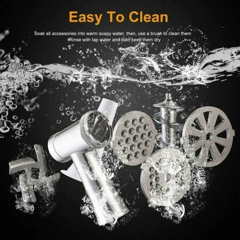 Nettoyez soigneusement toutes les pièces dans l’eau chaude. Ils ne sont PAS sans danger dans le lave-vaisselle.Toujours sécher les pièces immédiatement après le lavage pour une durée de vie plus longue. Les hachoirs de viande sont pour un usage domestique seulement .
