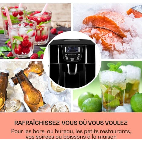 Conçu pour une utilisation en cuisine ou au comptoir d’un bar, la machine à glaçons Ice Volcano 2G de Klarstein travaille en continu pour produire des glaçons rafraîchissants en forme d’ogives quelle que soit l’occasion, lors de fêtes ou d’événements. Les premiers glaçons se déversent dans le grand bac de 0,6 kg après seulement 6 à 10 minutes. Le volcan de glace peut fournir jusqu’à 12 kg de glaçons en 24 heures et les fait glisser dans vos verres à long drinks ou à cocktail par le distributeur prévu à cet effet. Sélectionnez le petit ou le grand format pour que les glaçons aient la taille adaptée. Si le grand réservoir de 2 litres est vide ou que le bac à glaçons est plein, l’appareil à glaçons déclenche un signal sonore et s’arrête de fonctionner.