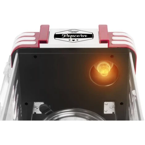 La machine dispose d’une puissance de 300 watts et peut chauffer la cuve à popcorn en quelques secondes. La température de la cuve est réglée automatiquement et atteint 350 °C. Une protection contre la surchauffe arrête la machine à popcorn à air chaud si la température maximale est dépassée. Ainsi, la machine à pop-corn séduit par son design compact et rétro 50’s, ses dimensions de 29 × 32 × 32 × 46,5 cm et son faible poids de seulement 3,45 kg.