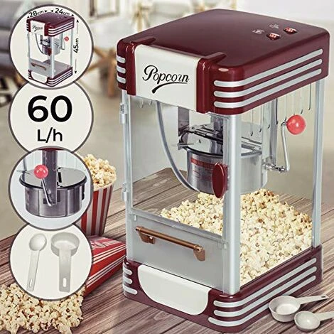 Vous allez adorer cette machine à popcorn de style rétro, et les souvenirs qui vont avec elle. Imaginez un bol de popcorn parfait, votre ami à côté de vous et ce marathon de films que vous avez envie de voir.Informations techniques:Dimensions (l/H/P): env. 24 x 45 x 28 cmCapacité du bol: env. 50 g Capacité de cuisson: 60L/h, 200g/10min Poids: 3.3 kgTension: 220 VFréquence: 50 HzPuissance: 330-360 WCaractéristiques importantes: 2 interrupteurs de commande: ON/OFFInterrupteur d’éclairageNécessite 1 ampoule de 10 W (incluse)Matériaux des pièces individuelles: Couvercle supérieur/inférieur et bouton en ABSCasserole en acier inoxydable et aluminiumCuillère et tasse à mesurer en PP (polypropylène)Couleur: rouge foncéétendue de livraison:1 x Machine à popcorn PPCM03 1 x Tasse à mesurer1 x Cuillère à mesurer l’huile1 x Notice de montage multilingue (EN/DE/FR/IT/ES) Remarque: Interdit de nettoyer des parties de cet appareil dans un lave-vaisselle.Remarque: La décoration n’est pas incluse dans la livraison.Remarque: Les couleurs peuvent légèrement différer de celles des images.Remarque: La livraison de nos produits aux îles n’est pas possible.