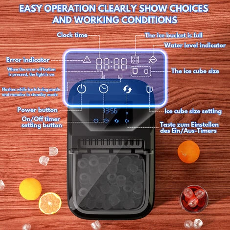 également de fonctions supplémentaires telles que l’alarme de manque d’eau, l’alarme de glace pleine et le message d’erreur. Cette élégante machine à glace est vraiment idéale pour l’été.