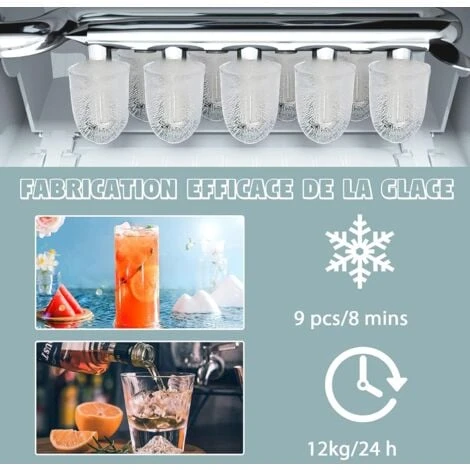 - ★PUISSANT ET EFFICACE★Grâce à sa puissance de 120 W et à son compresseur de haute qualité, notre machine à glaçons peut produire 9 morceaux arrondis de glaçons en 8 minutes(12 kg de glaçons / 24 heures), afin que vous puissiez déguster des boissons fraîches à la maison à tout moment pendant l’été chaud.