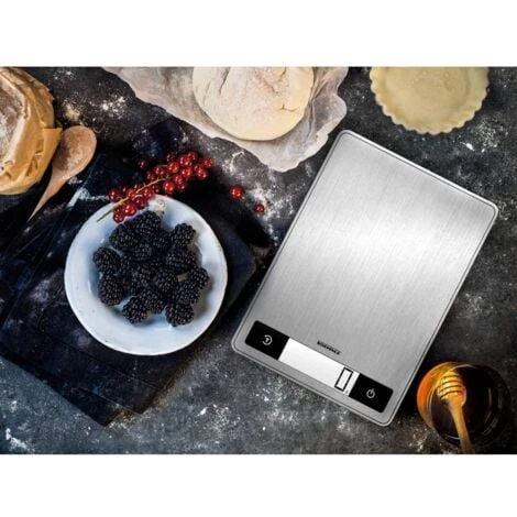 - Surface de pesage insensible grâce à l’acier inoxydable de haute qualité avec revêtement anti-empreinte Grand affichage LCD éclairé pour une lisibilité optimale des chiffres Charge maximale élevée de 15 kg (précision à 1 g près) Très grand plateau de pesée pour de grands bols et casseroles Fonction tare pratique pour peser confortablement différents ingrédients dans un bol Capteur tactile breveté pour une utilisation confortable et un nettoyage facile de la surface de pesée Design extra-plat pour un rangement peu encombrant Très économe en énergie grâce à la fonction d’arrêt automatique Stable grâce à ses pieds antidérapants Système de suspension pratique pour que la balance puisse facilement être accrochée au mur Immédiatement prêt à l’emploi grâce aux piles fournies Très longue durée de vie des piles de plus de 2 ans, avec une utilisation biquotidienne Affichage facilement commutable entre g et lb