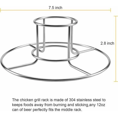 1.Le torréfacteur de poulet à bière est fabriqué en acier inoxydable 304 de qualité alimentaire de qualité supérieure. Il est assez durable et stable. Peut contenir environ 4 à 5 livres de poulet, assez pour empêcher la plus grande canette de bière de basculer sur le gril ou le fumeur. 2. Placez n’importe quelle canette ordinaire de 12 oz sur l’étagère du milieu et versez votre bière ou boisson préférée, chacune apportant une saveur différente au poulet. Placez le poulet mariné ou assaisonné sur la grille à poulet de la canette de bière, puis placez-le sur le gril ou le four. 3. Le porte-poulet en acier inoxydable résiste à la chaleur jusqu’à 572 ° F (300 ° C). Grille à rôtir adaptée au poulet, à la petite dinde, au canard et à l’oie plus moyenne. Mesures : 7,5 x 7,5 x 2,8 pouces. 4. Ce grill à poulet peut être facilement nettoyé au lave-vaisselle. Si nécessaire, vous pouvez également le tremper dans de l’eau additionnée de liquide vaisselle et le laver à la main. 5. Utilisation facile lors des fêtes et des réunions de famille – parfait pour la cuisson lente, le barbecue, les grillades en plein air, le camping, les pique-niques et le four intérieur.