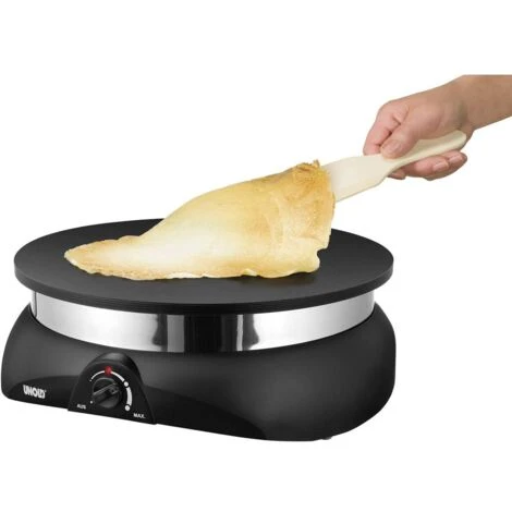 - Puissance : 1 250 W, 230 V~,, 50 Hz Plaque d’aluminium extra-large coulée sous pression à revêtement antiadhésif de qualité Diamètre du plateau : 33,0 cm Avec accessoire pour répartir la pâte et spatule en bois pour touiller Thermostat réglable en continu avec témoin lumineux Cordon d’alimentation amovible