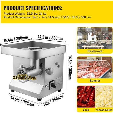 Parfait pour les restaurants, les supermarches, les fast-foods, les boucheries pour hacher la viande pour les hamburgers, le pain de viande, les saucisses, etc. Peut egalement etre utilise pour hacher les legumes, tels que les poivrons, lail, les carottes, etc.