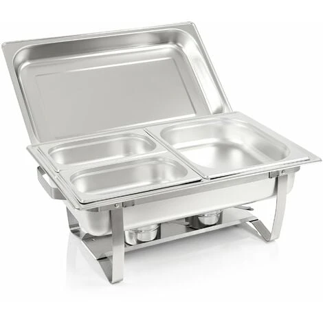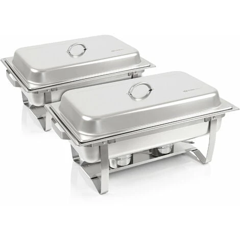 Le set se compose de deux récipients d’eau chaude remplis d’un récipient GN 1/1, d’un récipient GN 1/2 et de deux récipients GN 1/4. En plus des couvercles, quatre contenants de pâte combustible sont également inclus.